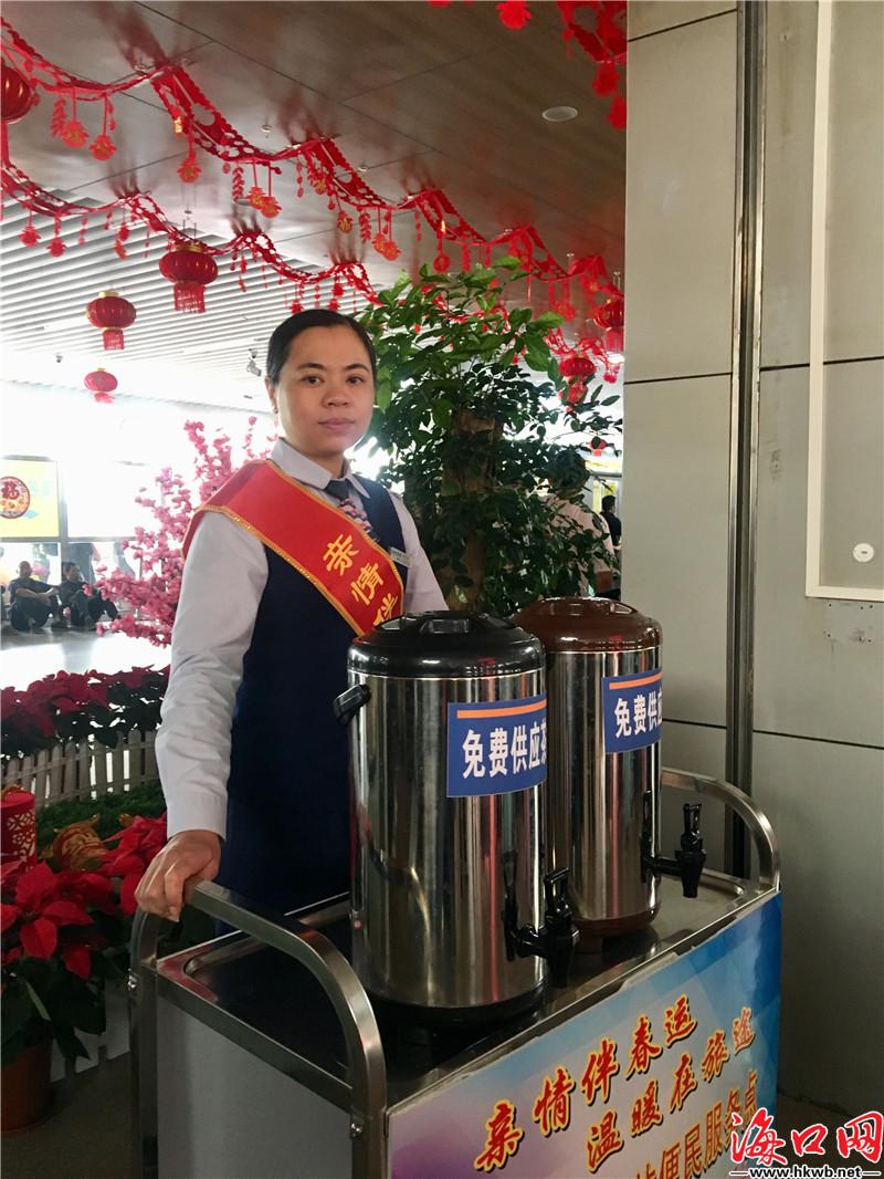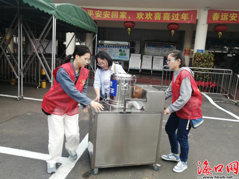 【为返乡旅客免费供应热茶水】春运期间,海汽集团在海口汽车西站开展“亲情伴春运 温暖在旅途”便民服务,免费为返乡旅客供应热茶水。“每一年春运,海口省际总站都会推出暖心服务,提供免费的茶水。春运第一天,岛外游客较多,欢迎有需要的旅客朋友前往品尝。”驻守服务点位的海汽集团员工陈秋梅说道。(记者伍凤妹)