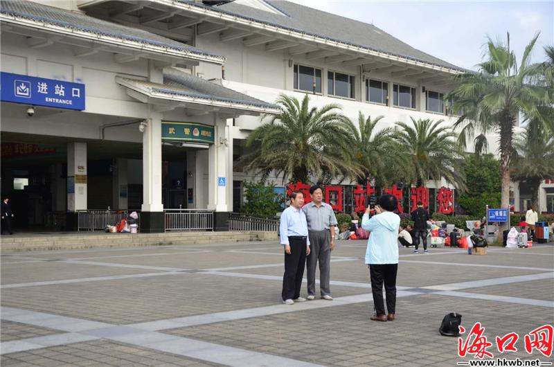 【回家路上与“海口”合影】春运第一天,记者在海口火车站站前广场看到,不少市民纷纷用手机或相机,和家人、朋友一起与“海口”合影。“这也算是旅途中的一个纪念,告诉他们,我们要回来过年啦。”即将踏上火车的陈先生说道。(记者卢海浪)