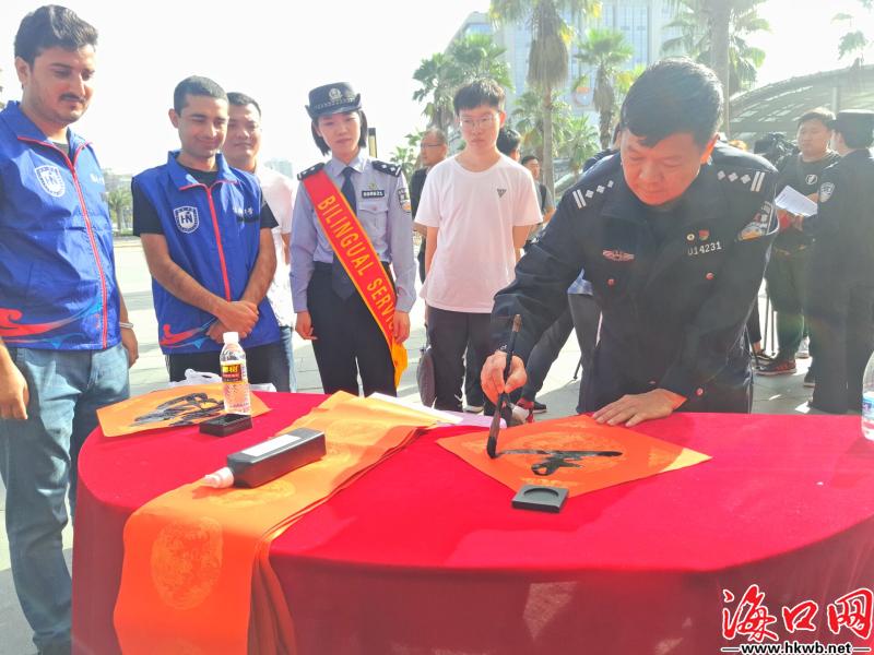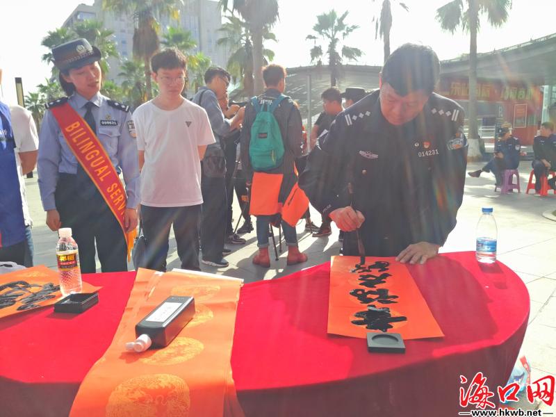 【把祝福带回家 民警书法好手现场赠春联】春运路上怎么能少得了民警蜀黍的祝福?在海口火车东站广场,海口东车站派出所今年推出了系列暖心服务,不仅制作了写有“全家福”三个大字的背景板供旅客合影留念,还邀请民警队伍里的书法好手现场挥毫,为返乡旅客赠送春联。(记者黄晖)