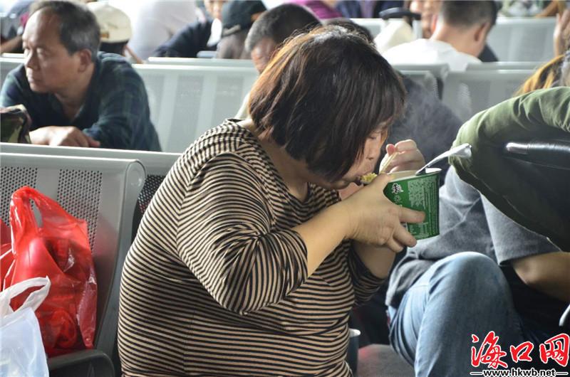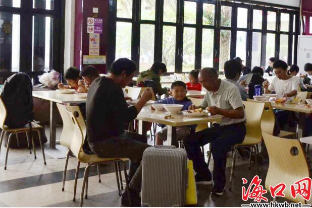 【吃饱了再回家!】10日中午,在海口火车站的站内餐厅内,旅客们正在享用自己的午餐。来自甘肃的拦先生带着孙子正大快朵颐,“我是带着孙子过来旅游的,现在要过年了,该回家了。”(记者卢海浪)