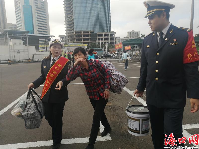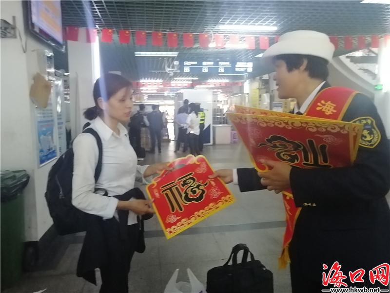 【漫漫返程路 志愿者随行】春运首日,在秀英港候船大厅、售票厅、入站口等人流密集的区域,海口海事局和秀英区的志愿者们为旅客帮提行李、提供安全宣传、出行咨询、引导候船等贴心服务,现场还为旅客们送上福字礼袋。海口海事局工作人员介绍,今年春运,他们创新工作方法,安排志愿者随行上船,为旅客提供服务,普及水上安全知识。(记者李佳佳)