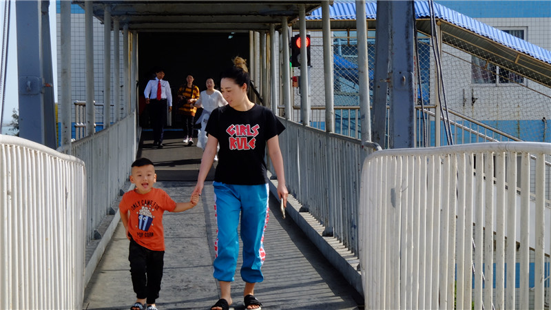 【工作人员耐心提醒、维持秩序】船舱内,乘务员耐心提醒乘客上扶梯“请小心脚下”;船舱口外,工作人员引导登船的人和车分流,维持秩序。(见习记者朱晓欣)