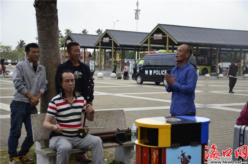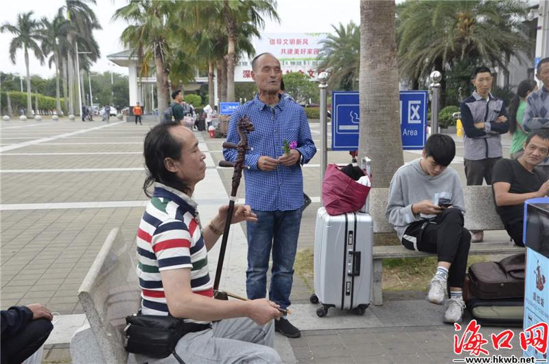 【总有一首歌,唱出你的回家心声】“啊,我们意气风发,走进那新时代,我们唱着东方红,当家作主站起来,我们讲着春天的故事……”10日下午,在海口火车站门前,一首《走进新时代》响彻整个广场,两名返乡旅客一个拉着二胡伴奏,一个高声歌唱,为等车的旅客带来一场精彩绝伦表演。(记者卢海浪)