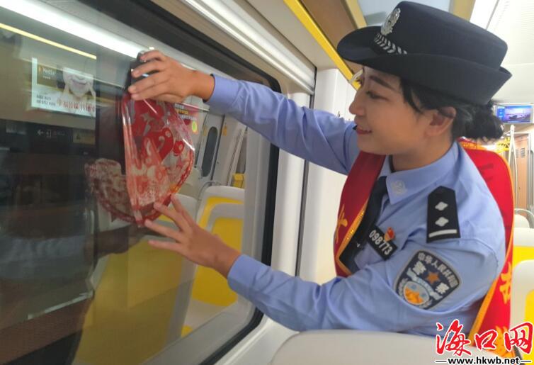 【温暖回家路!“年味列车”上线】春运大幕开启,在海南东环铁路的动车上,铁警将红色的年味剪纸贴到动车车窗上,回家路上年味满满。(记者黄晖)