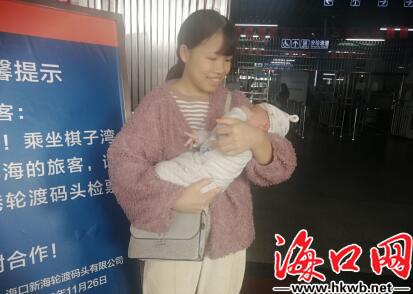 【带着宝宝回家过年】在秀英港的候车室外,1个多月的小浩铭依偎在妈妈的怀里,他要和爸爸、妈妈、哥哥、姑姑一起回广西老家过年。小浩铭的妈妈说,她们夫妻俩在海南工作,小浩铭在海南出生,这是他第一次坐船。(记者李佳佳)
