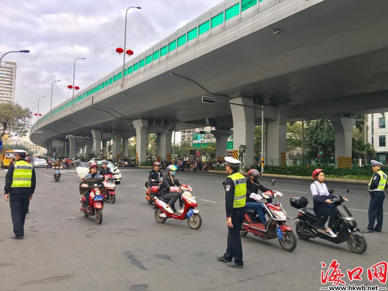 【海口交警为旅客返乡路护航】10日上午,在海口汽车西站,海口交警开展电动车集中整治行动,对无牌电动车进行扣押,对不戴头盔的驾驶人进行劝导教育,为旅客安全返乡路保驾护航。(记者伍凤妹)