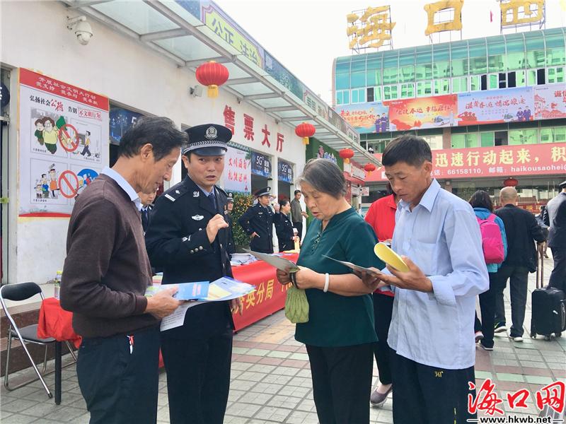 【提高返乡旅客防诈骗意识 海口市公安局秀英分局在行动】“要到售票厅购票,贵重物品不离开视线,在新的环境中不要睡觉,不要轻易相信陌生人……”10日上午,海口市公安局秀英分局在海口汽车西站开展“110宣传日”活动,对外宣传110的工作,此外,还发放防范传销犯罪、非法集资、防范加盟类合同诈骗等宣传页,提高返乡旅客防诈骗意识。(记者伍凤妹)