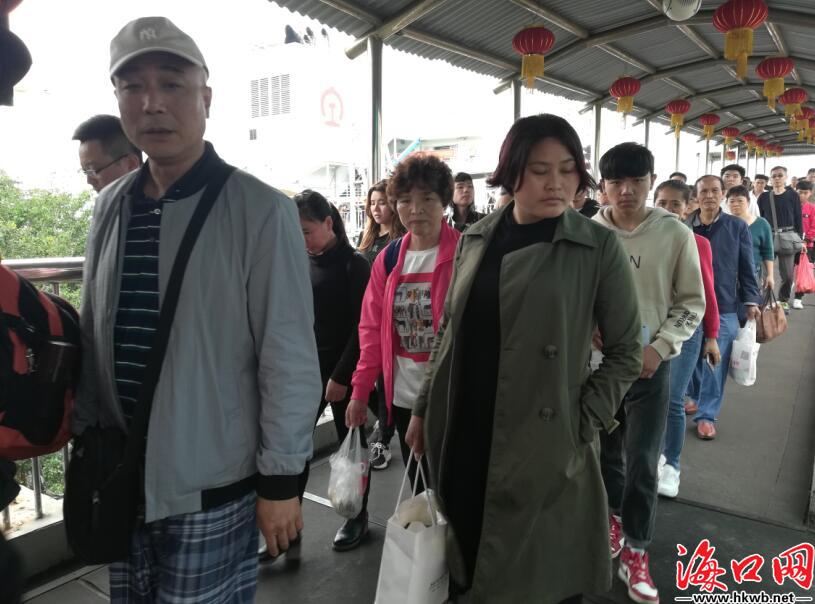 【旅客登上开往海南的跨海渡轮】11:50,在徐闻北港,前往海南的旅客陆续登上跨海渡轮。其中既有前来旅游的游客,也有回家的海南人。(记者陈亮嘉)