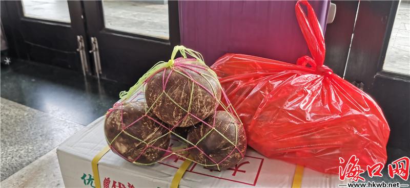 【“外婆,我什么都不要,只要椰子”】在海口汽车西站,来自贵州的闵女士正在候车,边上放置着打包好的10个椰子。她告诉海口网记者,自己在文昌务工,回乡时接到孙子的“圣旨”:“外婆,我们什么都不要,只要椰子。”闵女士说,海南的椰子已经成为了孩子们的心头好、梦中宝。(记者伍凤妹)