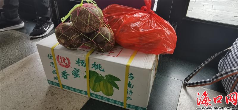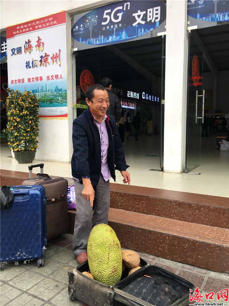 【带个椰子回家过年】10日上午,在海口火车站内,来自湖南的周先生向海口网记者展示自己今年带回家的礼物,“椰子、杨桃、香蕉、芒果,这些都是老家没有的水果,带些回家给家人尝尝。”(记者卢海浪)