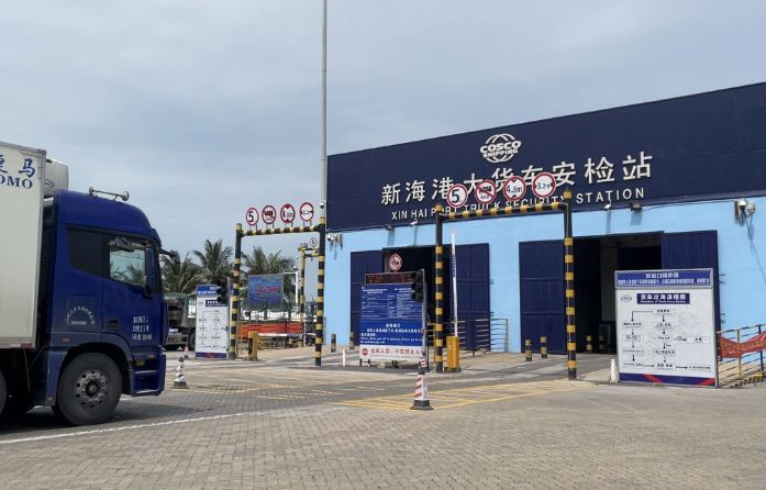 27日,海口网记者在新海港外看到,现场设置了车牌识别设备,可自动识别车辆信息。