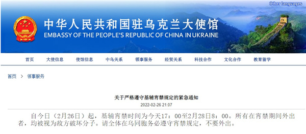 驻乌克兰使馆发布《关于请拟自乌克兰撤离中国公民进行登记的紧急通知》